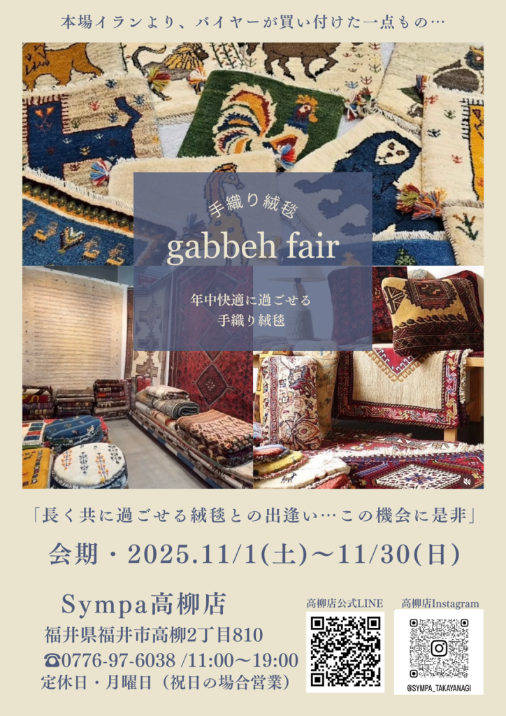 0111月11:00 AM30(11月 30)7:00 PM【高柳店】『世界にひとつの手織絨毯 ~ギャッベフェア~』あたたかさとアートが息づく、イランの手織り絨毯「ギャッベ」