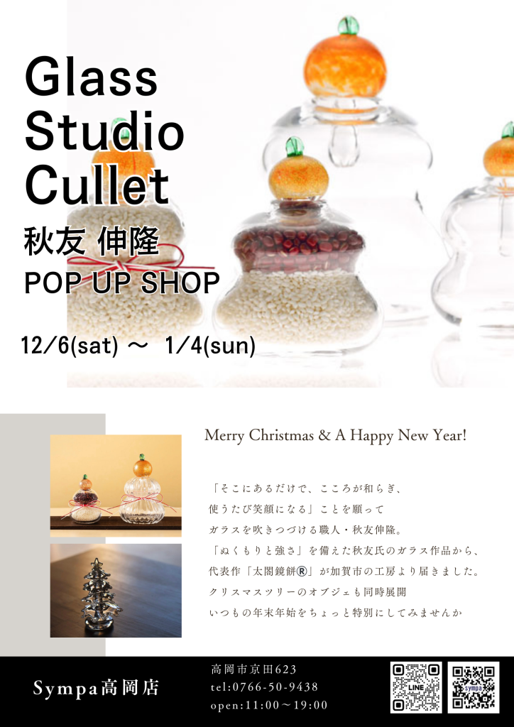 「Merry Christmas & A Happy New Year!」 石川県を拠点に活動するガラス工芸家・秋友伸隆氏。古くから親しまれてきた日本の文化や季節行事を、独自のガラス表現で現代の暮らしに溶け込むアートへと昇華させる作家です。透明感あふれる素材に繊細な技術を重ね、手仕事ならではの揺らぎや温度までも感じさせる作品は、インテリアとしてだけでなく「日常を美しく整える存在」として多くのファンを魅了しています。