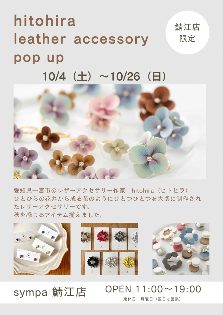 花びらのように、一つひとつ丁寧に手づくりされたレザーアクセサリー 愛知県一宮市を拠点に活動するレザーアクセサリー作家によるPOPUPを開催します。「ひとひらの花弁から成る花」のように、ひとつひとつ丁寧に手作業で仕上げられた作品が並ぶ、秋の訪れを感じる温かなイベントです。 秋を彩る、レザーの温もりと繊細なデザイン 秋の装いにぴったりな新作アクセサリーが勢ぞろい。ピアス・イヤリング・イヤカフ・バングル・ネックレス・ブローチなど、コーディネートに合わせて楽しめる豊富なラインナップが魅力です。