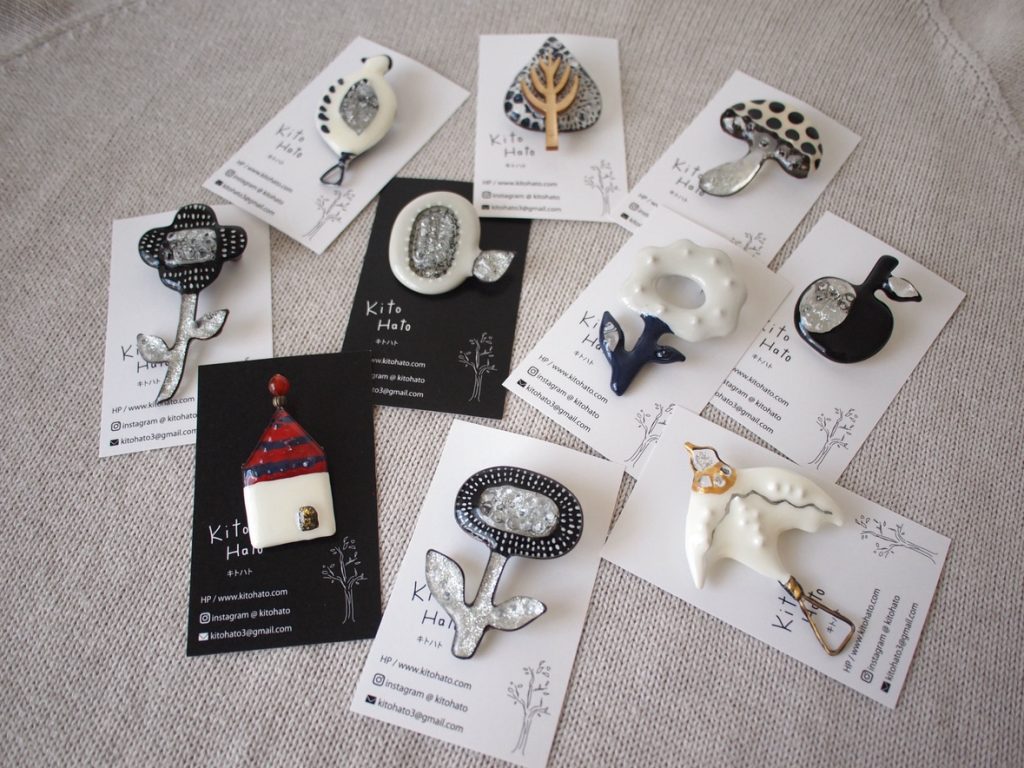 ブローチを中心に展開する「KITOHATO キトハト」のブローチは、ナチュラルな木の質感を活かしたデザインで、普段の装いにやさしいアクセントを添えます。自然の葉や花、動物や空想の世界を描いた遊び心あるデザインや、樹脂・ガラスの透明感を活かした繊細な表現まで、多彩なラインナップが魅力です。