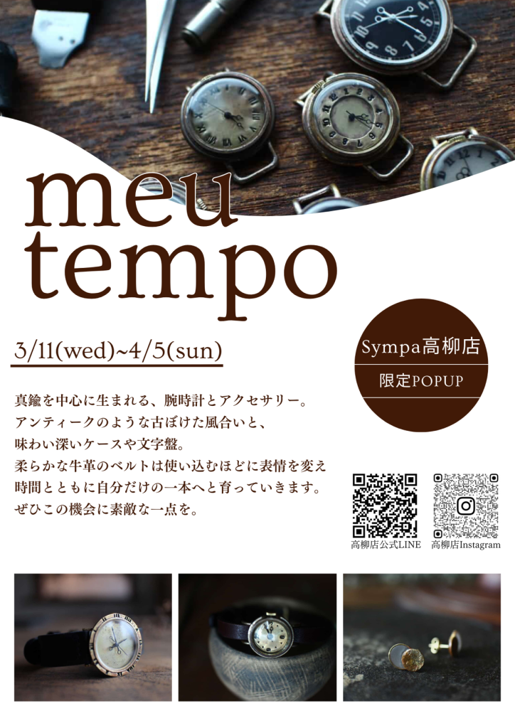 113月(3月 11)11:00 AM054月(4月 5)7:00 PM【高柳店】 meu tempo POPUP真鍮から生まれる腕時計とアクセサリー