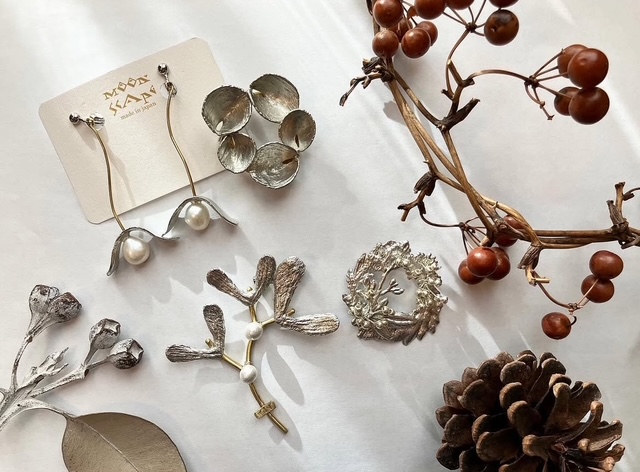 身近な自然界にある“美しさ”と“儚さ”、そして“季節の移ろい”をテーマに、ピューター(錫合金)と真鍮(しんちゅう)を用いて丁寧に仕立てた装身具。