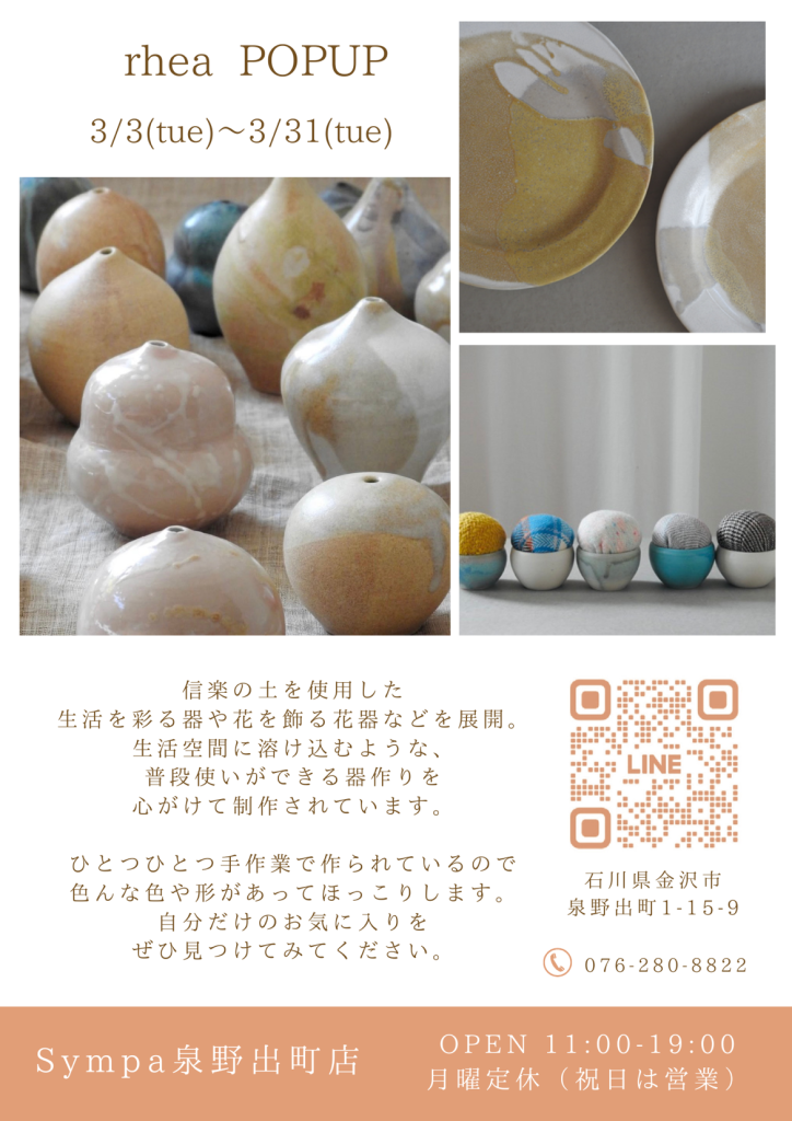 033月(3月 3)11:00 AM31(3月 31)7:00 PM【泉野出町店】rhea POPUP信楽の土から生まれる器