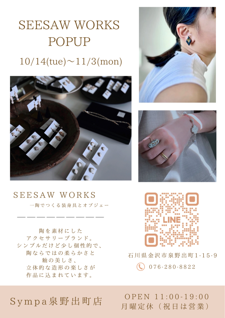 1410月(10月 14)11:00 AM0311月(11月 3)7:00 PM【泉野出町店】SEESAW WORKS POPUP秋の彩りとともに楽しむ、陶のアクセサリー