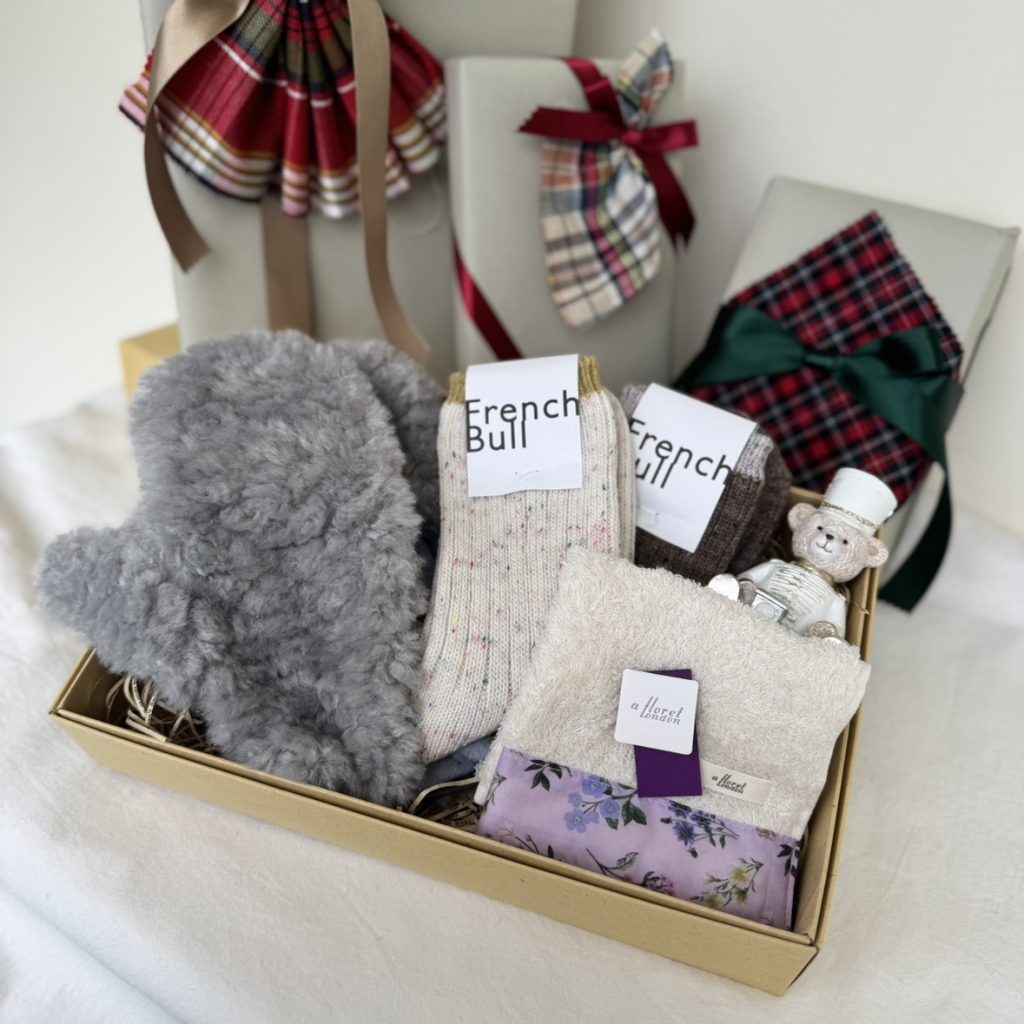 手元を温めるミトンや上質ソックス、毎日使えるタオルに、飾るだけで心がほぐれるミニチュアオブジェを添えた、冬ならではのぬくもりを贈れるセットです。