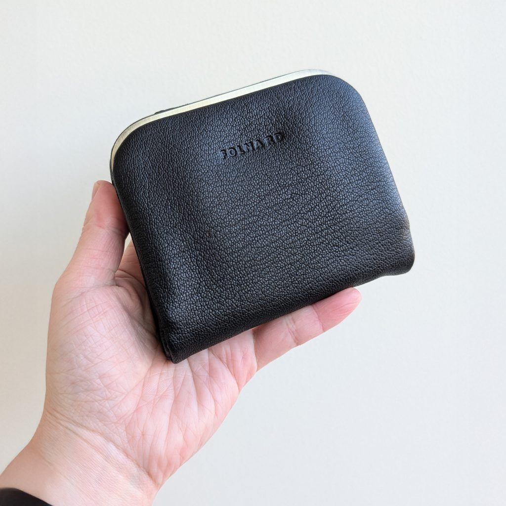 装飾を抑えたミニマルな佇まいの、天溝がま口二つ折り財布。