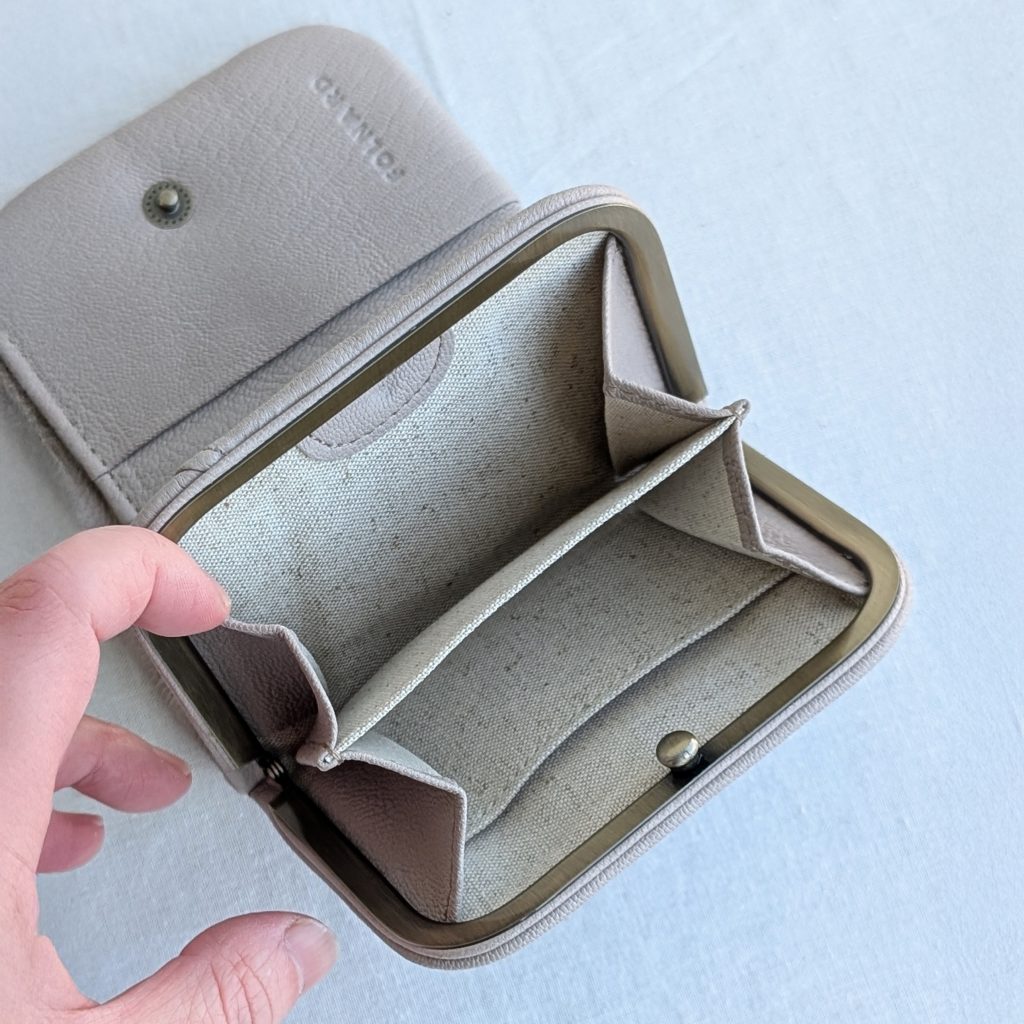 内側に金具を収めた天溝口金は、軽い動作で開閉でき、見た目もすっきり。がま口内部は2室+小ポケット付きでコインを整理しやすく、札入れ1カ所・カード7枚収納と、スマートながら実用性も十分です。