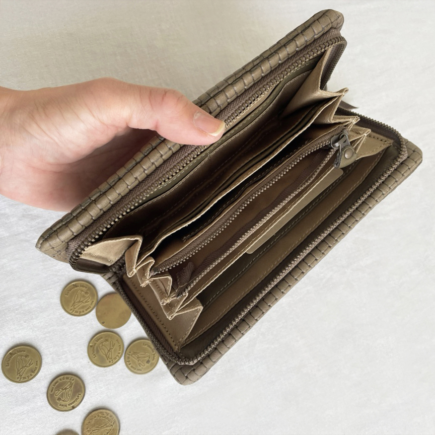 大きく開くL字ファスナーの内側は、中央の小銭入れを仕切りに左右へ収納でき、紙幣やカードをまとめて収められます。