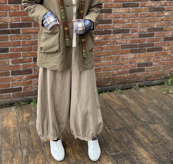 丸みのあるバルーンシルエットが魅力。ウエストゴム&内紐仕様でラクな穿き心地に。