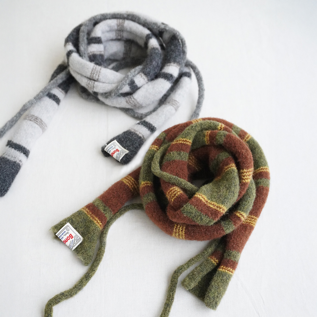 ボーダー柄がさりげないアクセントになるストール。首元に程よく収まる細幅タイプで、巻き方次第で表情が変わります。軽やかな着け心地ながら、防寒性もしっかり確保。コートやニットに合わせやすく、デイリー使いに最適です。