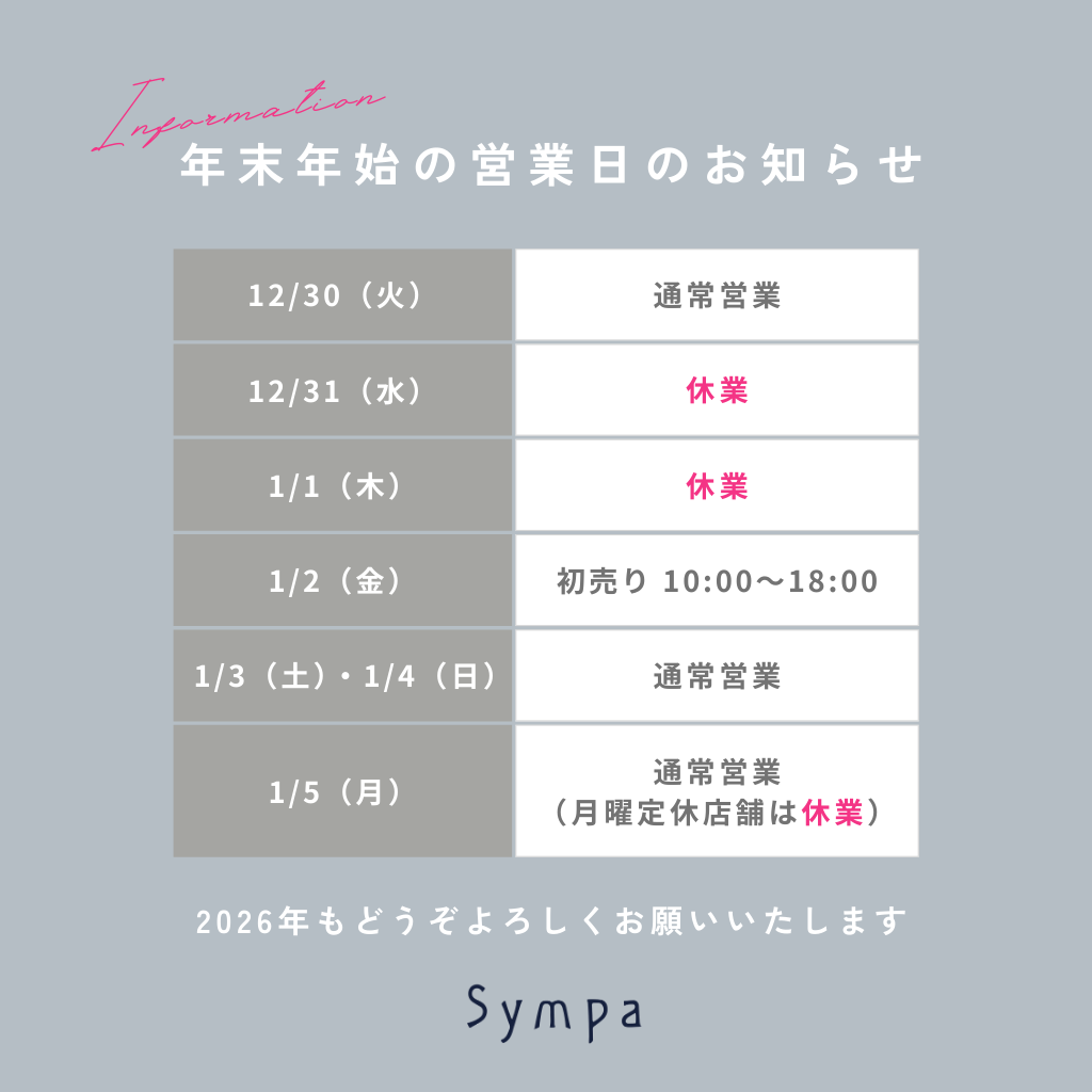 2025.12.25年末年始の営業ご案内今年もSympa各店へ足をお運びいただき、誠にありがとうございました。来る年も、皆さまにとって笑顔あふれる一年になりますように。新年は1月2日(金)10:00より、Sympa各店にて初売りを開始いたします。福袋をご用意して、皆さまのご来店をお待ちしております。